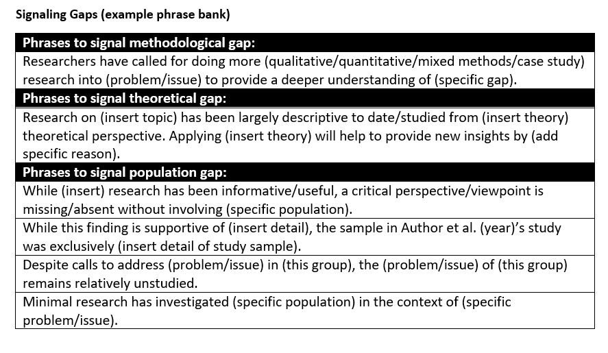 Here is a phrasebank of sample starting sentences for each different type of research gap that you can use to help with your academic writing.
